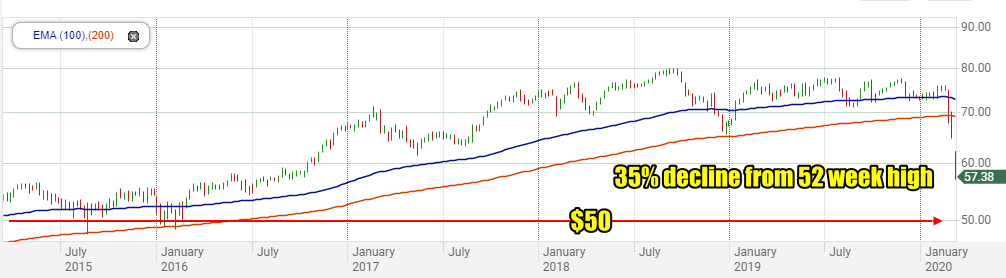 All the banks were hammered today and I don’t think the selling is over but bargains are beginning to appear. A good example would be buy shares in TD today at the close for $57.38 an selling the $52 call strike for $7.00 For April 17. If the stock fell below $52, my cost basis would be $57.37 less 7 = $50.38. At $50, it would represent a 35% decline from the recent 52 week high and it places my trade in at long-term support. The annual dividend is $3.16 which at $50.38 works out to 6.2%. Depending on how bad the oil war gets and how low oil prices go, TD Stock could of course fall lower. But if it did, I would sell covered calls at lower put strikes to keep the trade bringing in income. The next support level in the stock is at $40 from back in 2011 to 2013. TD Bank is not the bank it was back then. It is bigger, better capitalized, has much higher earnings and a stronger balance sheet. I think $50 would be an amazing price to own the stock. These are the types of trades I am watching for and will work my portfolio into on a small scale, using small amounts of capital over the coming weeks.
