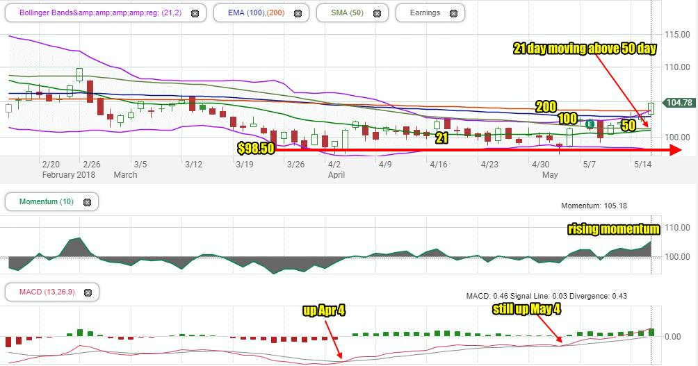 The 21 day which has been below all three major moving averages has now turned higher and is back at the 50 day and could break above it later today (May 17 2018) signaling a major up turn in the stock. Momentum is rising and MACD still has an up signal in place. It issued an up signal on Apr 4 and confirmed it again on May 4. The up signal is still valid today.